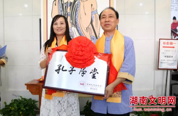 中南大学国学研究中心常务副主任刘孝听为社区工作人员授牌“孔子学堂”。图片来源:湖南文明网