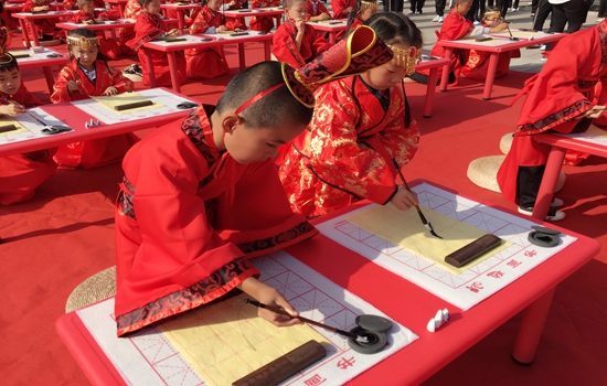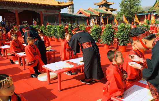 当天,来自汾阳市南门小学近200名身着汉服的孩子们先后进行朱砂启智、击鼓明志、读书习礼等仪式,亲身体验“人生第一大礼”——开笔礼,切身感受尊师重教,读书习礼的传统美德。