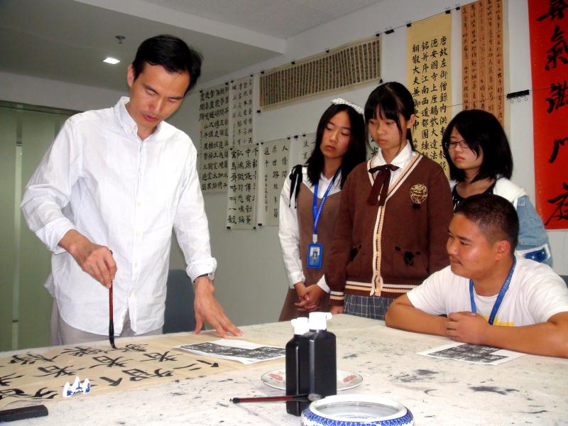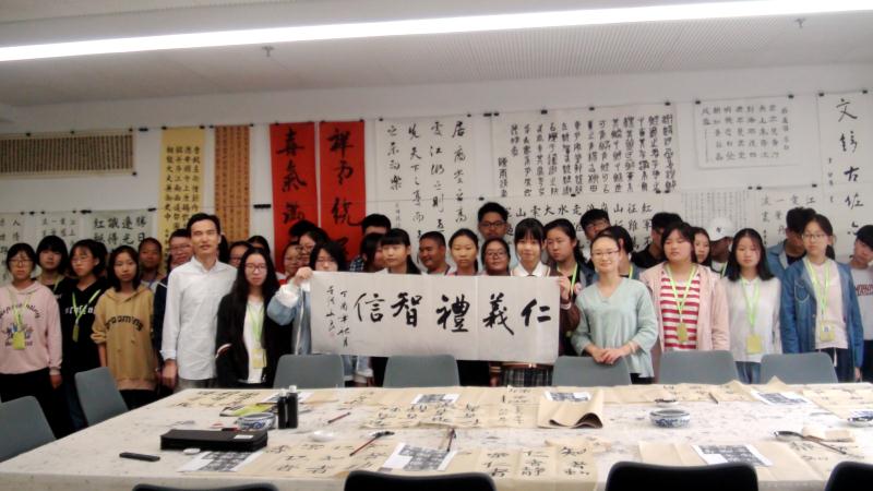 接下来,花桥商务城中专的诵读社举行了简单而庄重的“祭孔”仪式。大家学汉礼,祭拜孔子,并充满激情地诵读《论语》六则、《相信未来》,昆山图书馆的朗诵团也与同学们进行了互动交流。同时,在二楼书法室,中国书法家协会、昆山青年书法家协会主席居永良老师带领学生们一起用最传统书写方式——写毛笔字记录经典、怀念先贤。在四楼的报告厅,昆山市作家协会会员李金海为同学们开设了主题为“穿越历史看孔子”的专题讲座。
