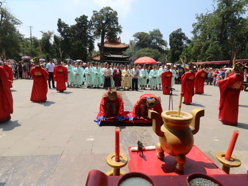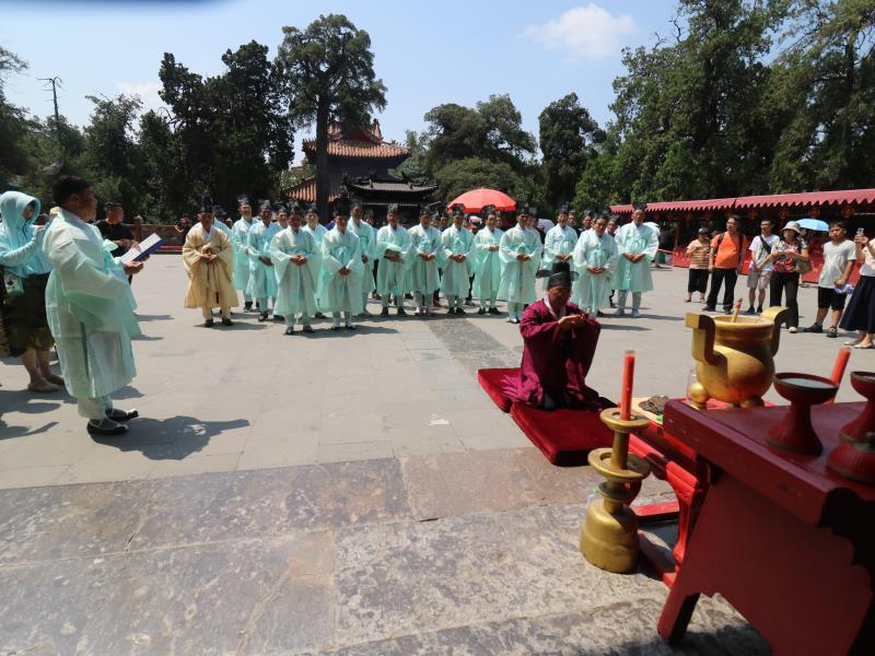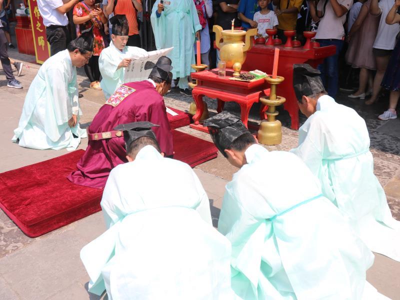 7月14日,来自韩国全罗南道的灵岩乡校典长、会长及工作人员40人,在曲阜举办了庄重的祭孔仪式。韩国客人先是按照韩国的祭孔程序进行了祭拜,诵读祭文、上香、献酒、跪拜。上午11时,伴着浑厚悠扬的古乐,由曲阜三孔旅游公司主持的祭孔释典礼正式开始。韩国祭拜嘉宾列队进入大成门登上大成殿露台,按照中国古代的仪式举办了隆重的祭祀仪式。当天骄阳似火,酷暑难当,很多韩国参拜嘉宾都是年过七旬的老人,但他们怀着对东方圣人的虔诚敬仰,身着韩服盛装,表情庄严肃穆,举止毕恭毕敬,令在场的观众十分感动。