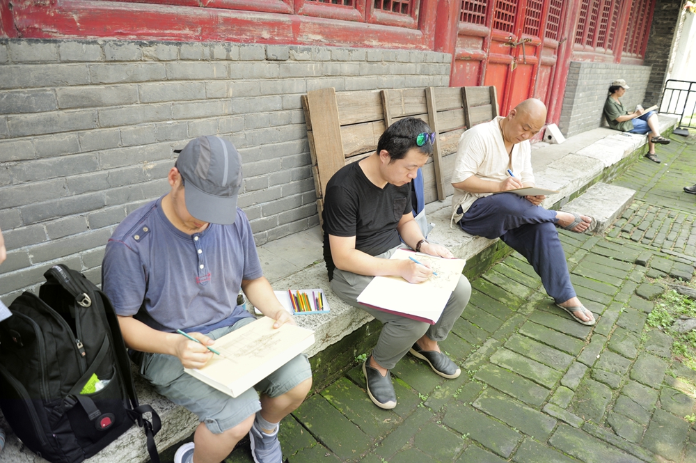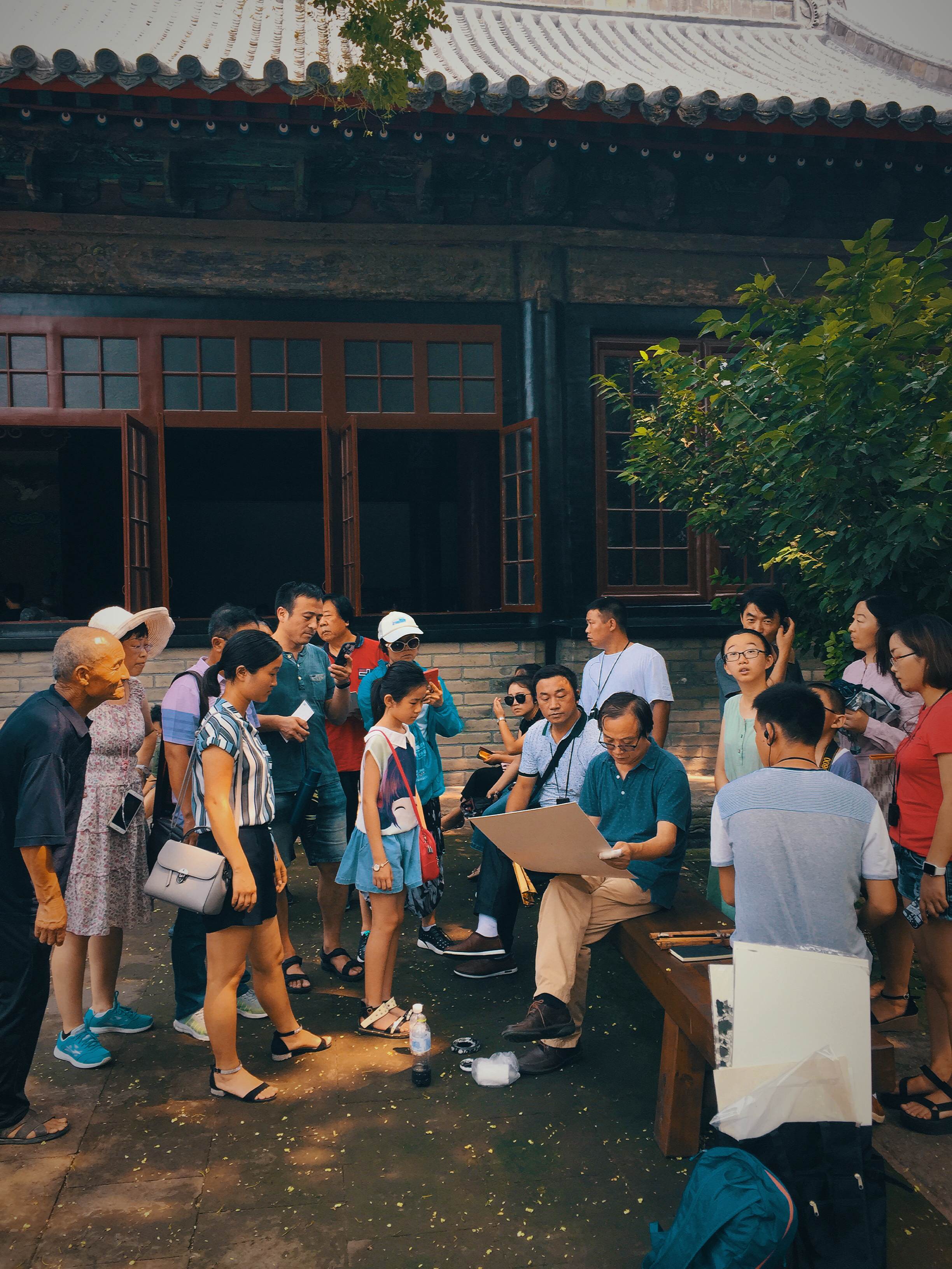 经过7日一天的视听冲击与文化洗礼,CIID第六专委会的专家顾问及设计师们的创作热情空前高涨,8日清晨早早的来到孔府,选取自己心仪的角度和对象,进行手绘创作。各位设计师的创作手法与形式不尽相同,但却共同拥有着对传统建筑的敬畏和对艺术的不懈追求,所以,整个手绘孔府的过程也是知行合一的过程。古建结构错综复杂,架梁、斗拱、线条等真正落实到画纸上是极难表现的。通过手绘古建,更加深入了解古建的结构,从而深层次理解其中的文化,进而研究文化,找到中华民族的文化基因,以此为出发点,真正回归本源,做好属于中国自己的中式设计。专家顾问及设计师们的“专业范儿”很快吸引了大批“粉丝”的围观和赞叹,其中既有暑期休假的学生,也有花甲之年的老者,他们不约而同地被手绘艺术所吸引和感染,很好地示范了“艺术下乡”。我们也由衷地希望通过我们的活动能让更多的人了解古建、保护古建,认识设计、热爱生活。
