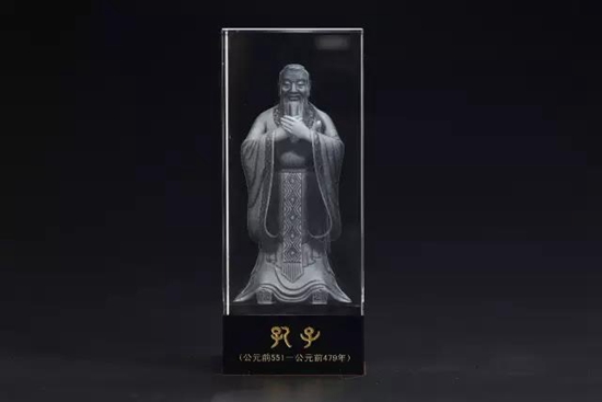 孔子水晶像采用激光三维立体雕刻工艺,整个孔子像四面通透,孔子形象栩栩如生;底座采用黑水晶材质,沉稳大方。