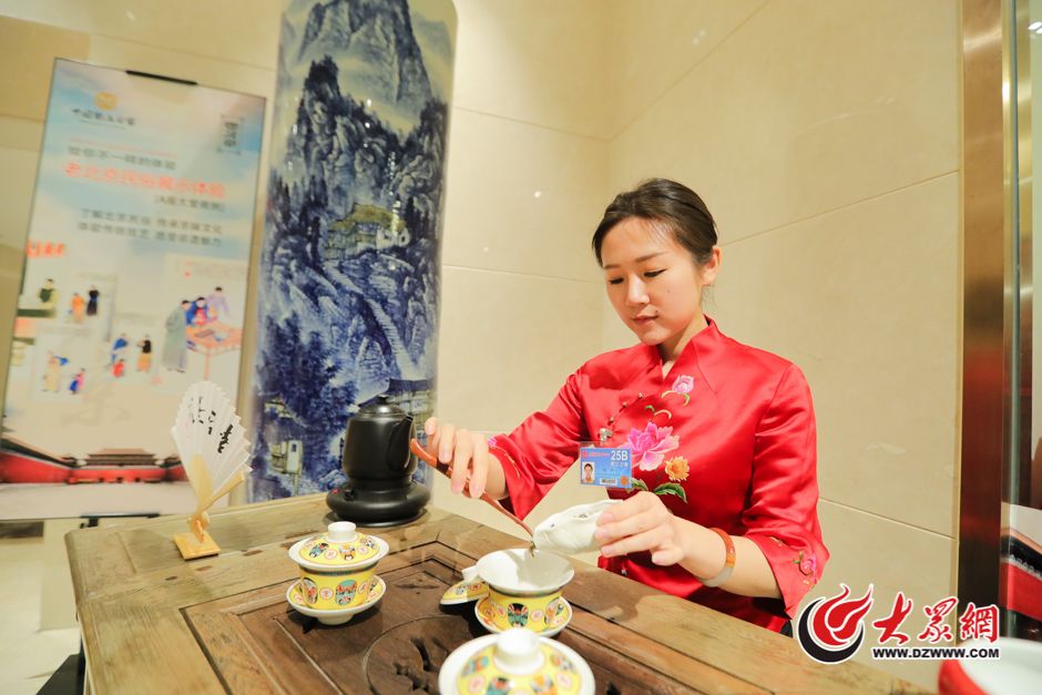 3月4日,在山东代表团住地,一名工作人员正在向代表们展示茶文化。