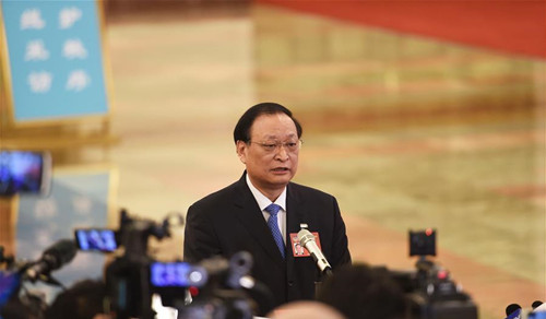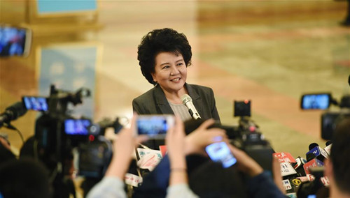 3月3日,中国人民政治协商会议第十二届全国委员会第五次会议在北京人民大会堂开幕。这是国务院侨务办公室主任裘援平在“部长通道”接受记者采访。