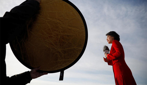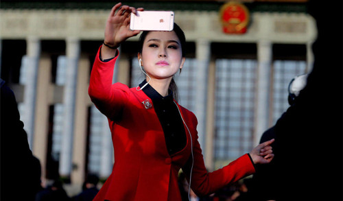 3月5日,人民大会堂前,一袭红衣的女记者。Reuters