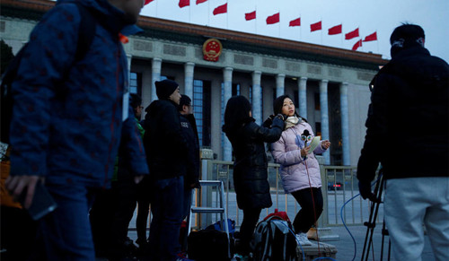3月5日,人民大会堂前,一名记者正准备直播。Reuters