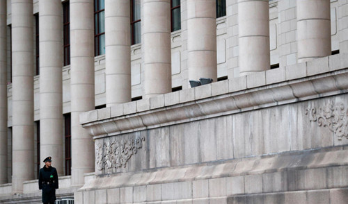 3月5日,人民大会堂前,一名执勤的武警战士。Reuters