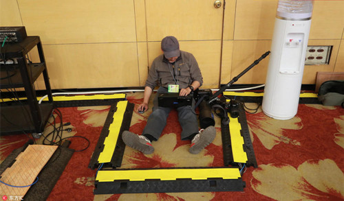 3月7日,十二届全国人大五次会议新闻中心举行记者会。一名男记者坐地板写稿子。东方IC