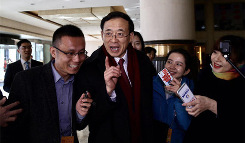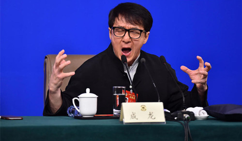 2017两会图片精选:记者坐地 成龙举“爪”
