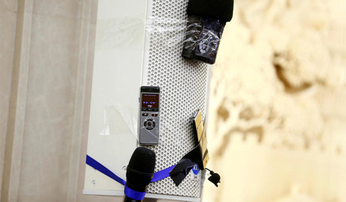 3月7日,北京,记者们的收音设备。Reuters
