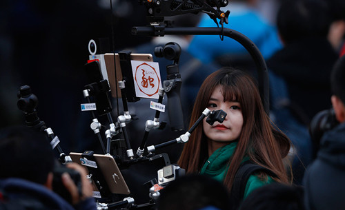 3月3日,全国政协十二届五次会议在北京人民大会堂开幕,一名女记者在场外直播。中新社记者杜洋摄