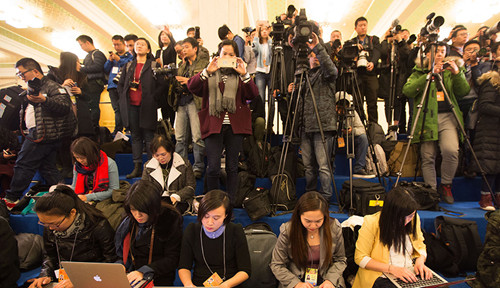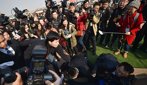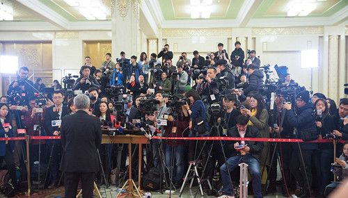 3月3日,全国政协十二届五次会议在北京人民大会堂开幕,外国记者在会场外采访。中新社记者杜洋摄