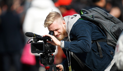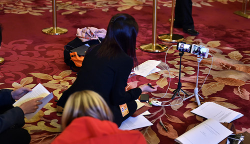 3月5日,第十二届全国人民代表大会第五次会议在北京人民大会堂开幕。图为记者在现场采访报道。中新社记者泱波摄