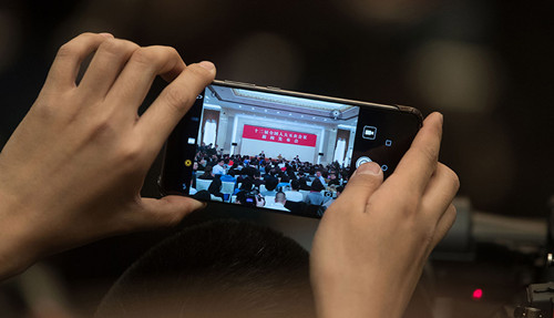 3月4日上午,十二届全国人大五次会议在北京人民大会堂举行新闻发布会,大会发言人傅莹就大会议程和人大工作相关问题回答中外记者的提问。图为记者用手机拍摄新闻发布会。中新社记者泱波摄