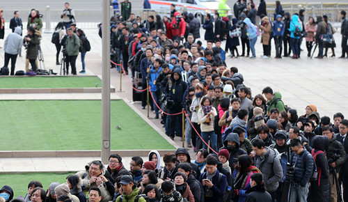 3月5日上午,十二届全国人大五次会议在北京人民大会堂开幕,媒体记者赶早排队入场。中新社记者泱波摄