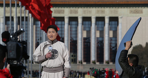 3月5日,第十二届全国人民代表大会第五次会议在北京人民大会堂开幕,一名少数民族记者进行现场报道。中新社记者杨可佳摄