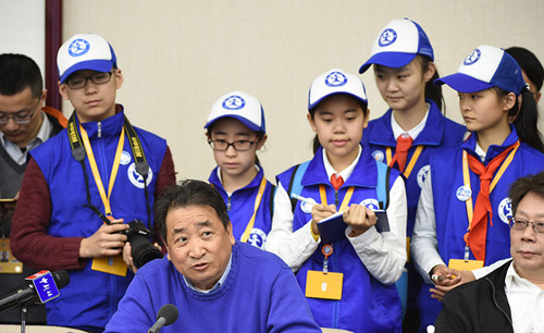 3月5日,全国政协十二届五次会议分组讨论政府工作报告,图为姜昆委员发言,新华小记者在现场采访。中新社记者侯宇摄