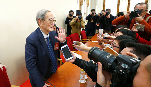 3月6日,全国政协十二届五次会议举行记者会,邀请厉以宁、陈锡文、杨凯生、常振明、钱颖一五位委员就促进经济平稳健康发展、深入推进“三去一降一补”、深入推进农业供给侧结构性改革、着力振兴实体经济、防范金融风险、推进“一带一路”建设等回答记者提问。图为会后厉以宁答记者问。中新社记者富田摄