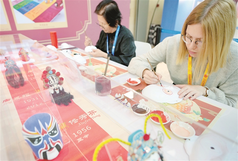 第三届“一带一路”国际合作高峰论坛日前在北京举行。设在该论坛新闻中心内的非遗互动展示区吸引了众多媒体记者前来体验。图为来自比利时的记者(右)体验画京剧脸谱。新华社记者 王毓国 摄