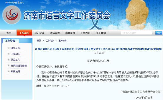 同时,本次活动更是得到了首都师范大学、山东大学、河南大学、苏州大学等高校的支持,并由山东省语言文字工作委员会办公室向全省大、中、小学转发吟诵大会的相关文件,形成了全省在官方体系内自上而下的推动。