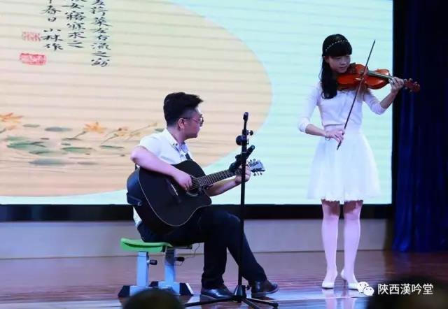 在那抑扬起伏的吟诵中,我们仿佛看到了些许昔日曾经的记忆:春江东流,柔情似水,远处河心的小岛上,不知是谁家善良的姑娘,打动了我们主持人智博老师的心,如痴如醉的爱慕,在古典与现代的碰撞中,在吟诵与吉他和小提琴的大胆融合中,让我们感受到了一首别样的《关雎》,那么美,那么浪漫,如果让太白先生看到,肯定又会留下几首不朽的绝唱。奈何,我们此刻只能在灞桥区庆华小学学生们别致的《静夜思》的吟诵声中,去聆听、感悟太白先生别样的思乡幽情了。
