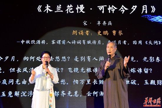 “可怜今夕月,向何处,去悠悠……”“独立寒秋,湘江北去,橘子洲头……”现场,湖南省吟诵学会会长、93岁的史鹏老先生与副会长曹琴女士带来了《木兰花慢·可怜今夕月》《沁园春·雪》等诗词的湘方言吟诵,让市民朋友尽享吟诵之美。