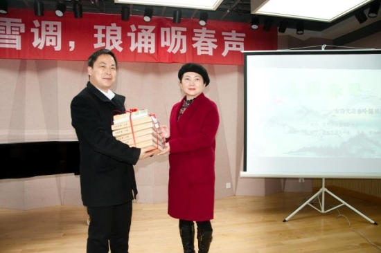 市文化馆副书记黄明彦代表市非物质文化遗产保护中心向五中赠送常州吟诵全套教材