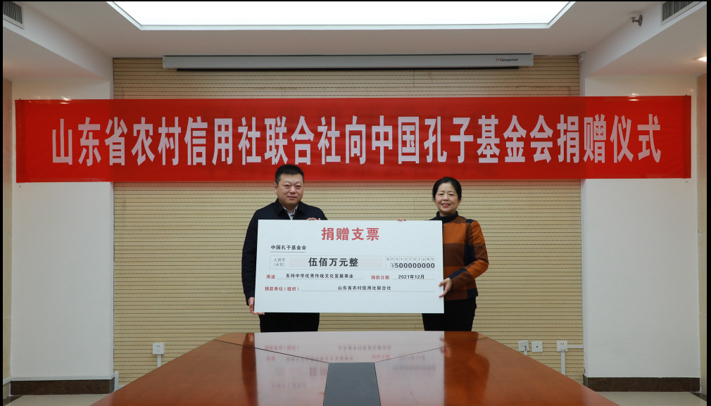 1月20日上午,山东省农村信用社联合社向中国孔子基金会捐赠仪式在济南举行。尼山世界儒学中心(中国孔子基金会秘书处)党委书记、副主任,中国孔子基金会副理事长、秘书长国承彦,山东省农村信用社联合社党委委员、副主任于富海出席捐赠仪式。