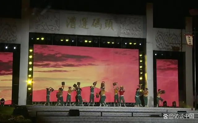 舞蹈《漕帮娘子》带领现场观众穿越时光隧道,让观众们看到了在运河名镇夏镇的运河湾,渔船、酒船、商船、米面船往来相接,群聚檐樯林立如街市,还有携子随夫漕帮娘子们忙碌的倩影。