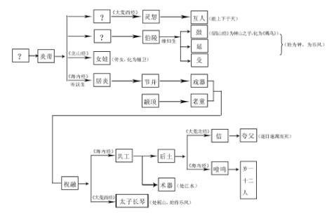 《海内经》:“流沙之东,黑水之西,有朝云之洞,司彘之国。黄帝妻雷祖,生昌意,昌意降处若水,生韩流,韩流擢首、谨耳、八面、豕喙、麟身、渠股、豚止,取淖了曰阿女,生帝颛顼”。由引文可得世系:黄帝——昌意——韩流——颛顼。