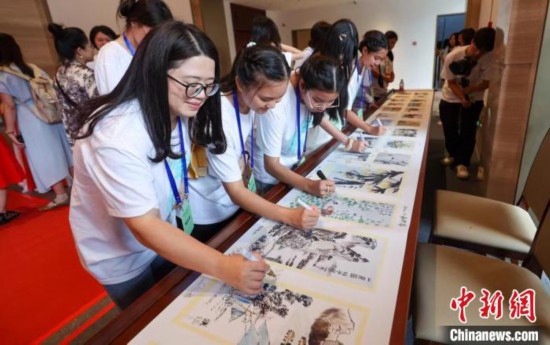 8月9日,第一届海外华裔青少年中华文化实践大赛颁奖典礼举行,海外华裔青少年们在书画长卷上签名。中新社记者 贾天勇 摄