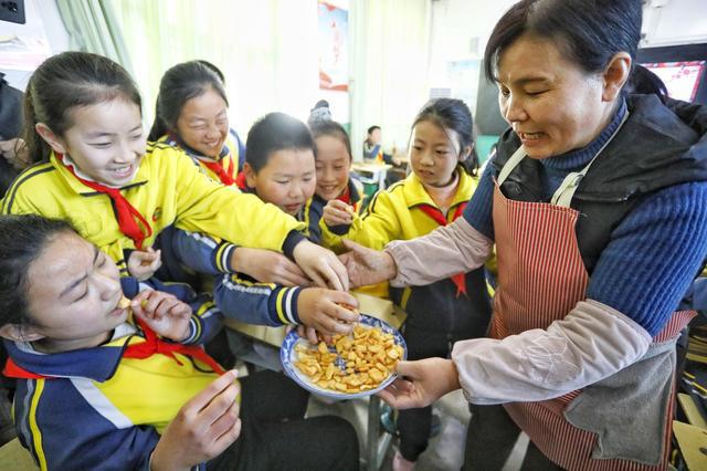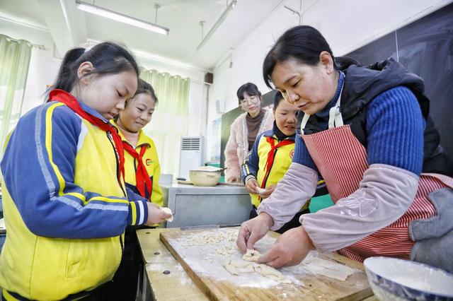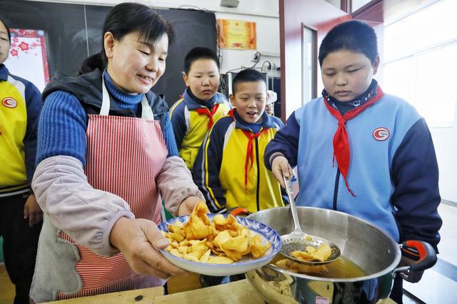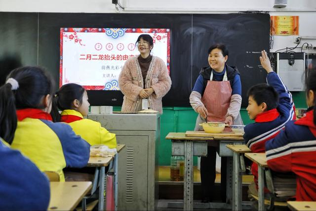 “同学们,二月二是什么日子?——‘龙抬头’!”2月21日,泰安市泰山区邱家店镇前燕光彩小学的课堂上,语文老师王倩问起五年级二班的学生,学生们异口同声地大声回答。一旁的光彩小学副校长李梅带起围裙和套袖,化身“大厨”,和面、擀皮、切片,泰安传统节日美食炸“面棋”慢慢成型。
