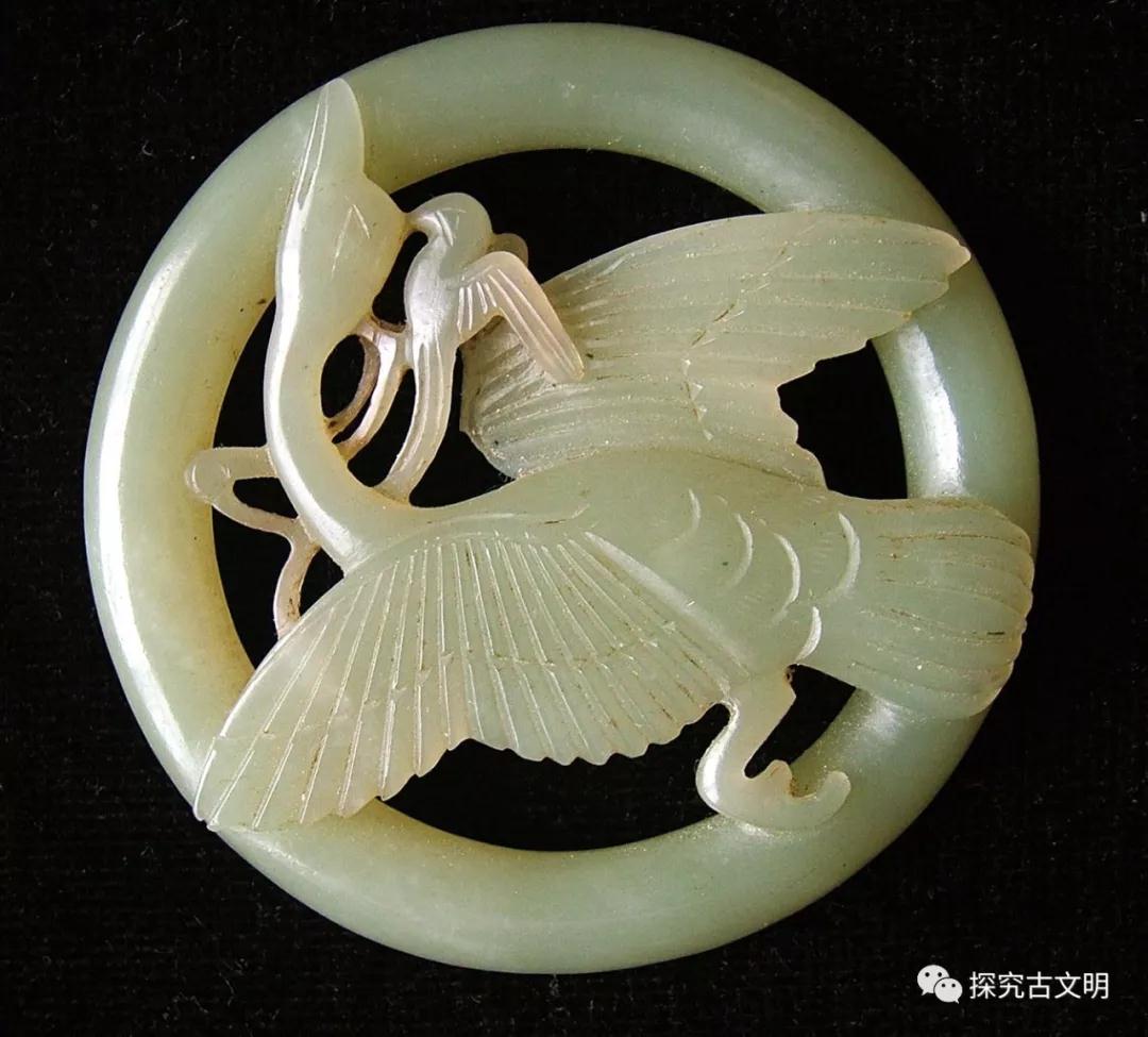 [辽金]玉“春水”饰,器体成椭圆,以镂空配合阴刻,一只天鹅匿于水草间,上有一海东青俯冲而下。北京故宫博物院藏。