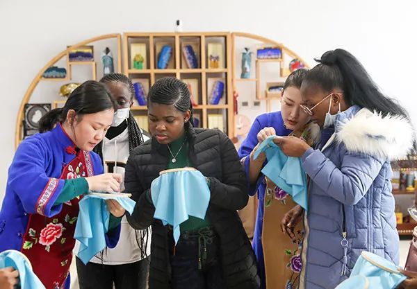 2021年3月3日,在辽宁沈阳盛京满绣工作室,留学生在老师指导下体验满绣技艺。(新华社图片)