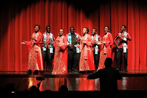 2021年11月12日,肯尼亚内罗毕大学孔子学院学生在“中国之夜”主题文化晚会上用中文演唱中国歌曲《套马杆》。(新华社图片)