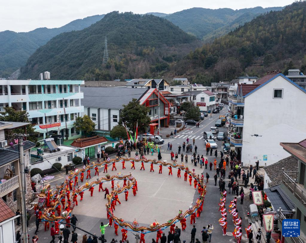 2月1日,窈口村女子板龙队在湖源乡进行板龙舞龙表演(无人机照片)。