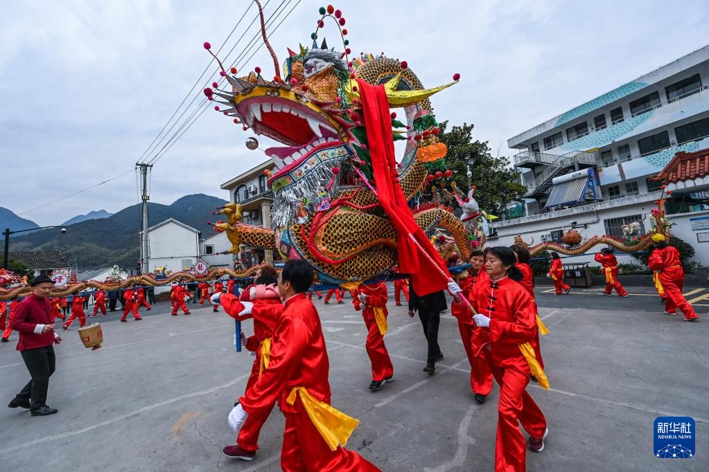 当日是农历正月十一,在梅花锣鼓的伴奏下,浙江省杭州市富阳区湖源乡窈口村女子板龙队举起由50余张板凳连起来的百米板龙舞动起来,拉开了湖源乡新春系列迎元宵活动的序幕。