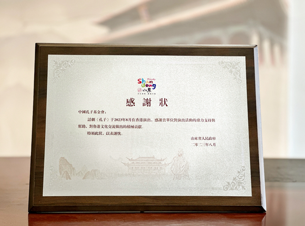 近日,由中国孔子基金会资助支持的话剧《孔子》在香港文化中心大剧院上演,演出获社会各界广泛关注、产生热烈反响,山东省人民政府为中国孔子基金会颁发感谢状,感谢中国孔子基金会为鲁港文化交流做出的积极贡献。