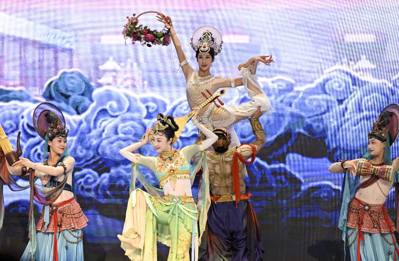 △5月30日,在第四届文明交流互鉴对话会的开幕式上,演员进行敦煌石窟文化艺术主题表演。新华社记者 张领 摄