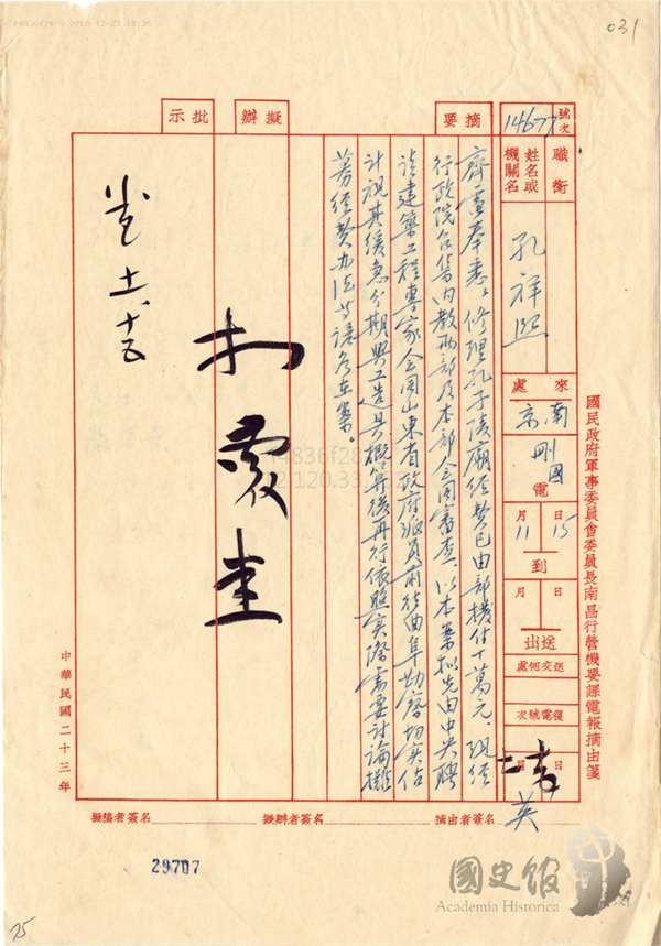 1934年11月15日,财政部长孔祥熙电告蒋介石已拨付修复曲阜孔庙经费10万元。