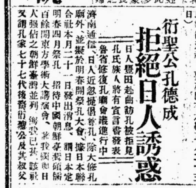 申报《衍圣公孔德成拒绝日人诱惑》标题下有“鲁省修复孔庙会议进行中”之副标题。