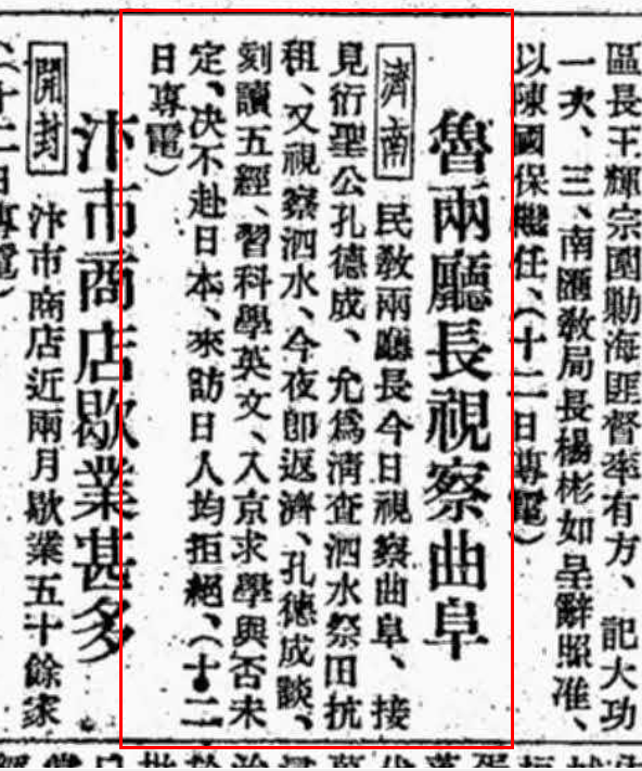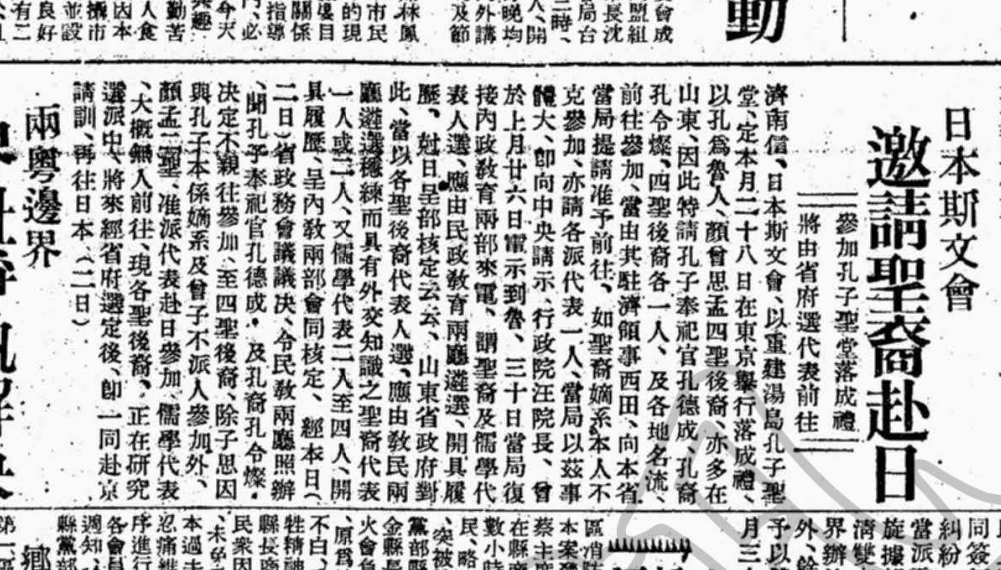 对于国民政府加速尊孔与日本拉拢圣裔之关联,中日两国舆论有充分之认识,多将两者相提并论。如《申报》新闻《衍圣公孔德成拒绝日人诱惑》标题下有“鲁省修复孔庙会议进行中”之副标题;该报还以“日人劝曲阜衍圣公孔德成赴日引起各方注意”为背景,详细介绍了国民政府修复孔庙、整理孔氏田产的动向。井上哲次郎也认为,南京国民政府“本年对孔、颜二氏子孙大表敬意,无论如何思考,都无外乎是受到儒道大会之影响”。尽管我们可以认为孔庙已受损有年,对其进行修复与日本无必然关系,可是,若不抢先将衍圣公纳入国民政府体系,即无理由限制其东渡,两者关联不言自明。