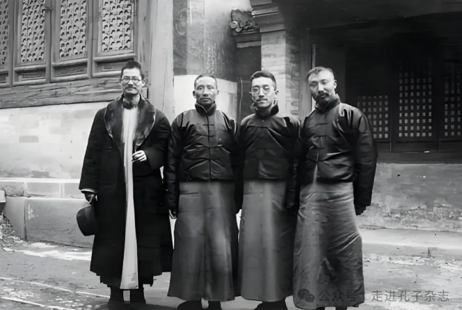 1920年3月,蒋梦麟、蔡元培、胡适与李大钊(从左至右)在北京西山卧佛寺合影