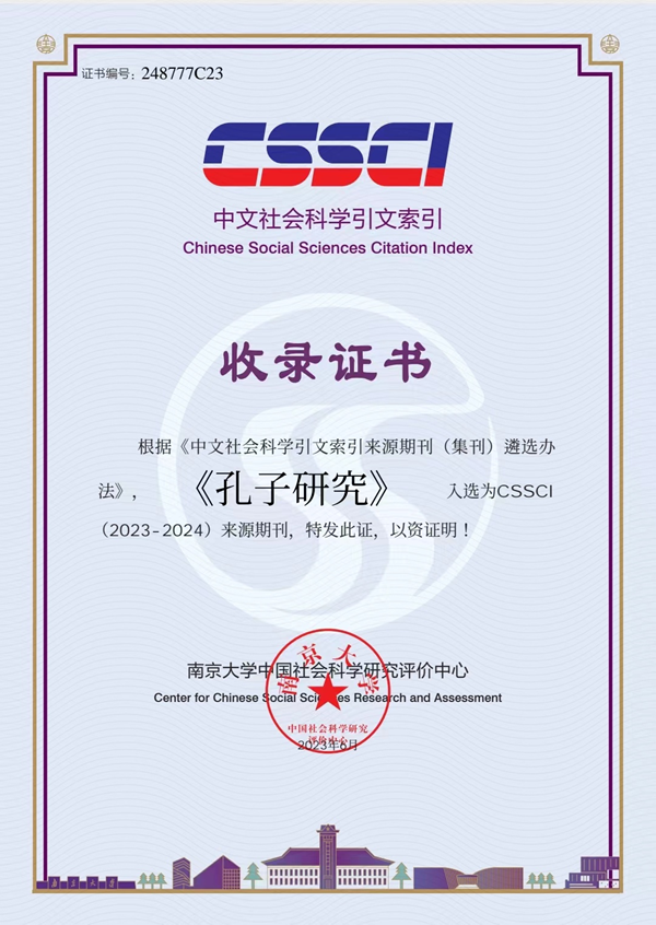 近日,《孔子研究》编辑部收到南京大学中国社会科学研究评价中心来函,根据《中文社会科学引文索引来源期刊(集刊)遴选办法》,《孔子研究》入选CSSCI(2023—2024)来源期刊。