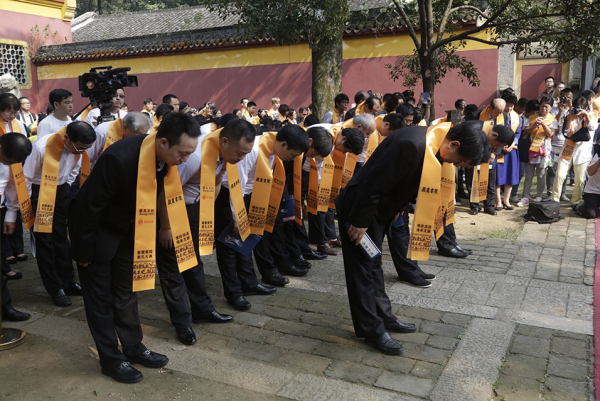 为纪念孔子诞辰2565周年,2014年9月28日上午9点28分,由岳麓书院、凤凰网、凤凰卫视联袂举办的“岳麓书院祭孔大典”正式举行。岳麓书院文庙大成门孔子行教像前,钟鼓齐鸣,气氛庄严肃穆,来自湖南及海内外各界人士代表300余人向至圣先师孔子行礼。活动现场还宣读了弘扬中华优秀传统文化倡议书。