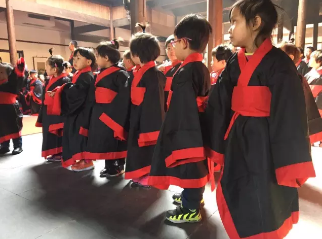 祭祖祭孔典礼之后,由家长带领孩子向老师行谢师礼,校长代诸师为同学们训教。愿我们的学子,志道据德,依仁游艺,博文约礼,志在圣贤。然后学生面向家长行报恩礼,感恩父母的生育养育呵护之恩。
