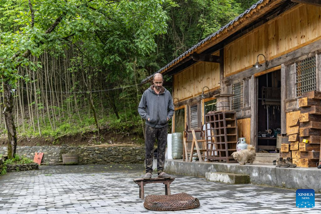 Vincent Cazeneuve is pictured outside his studio in Songbai Village of Beiping Town, Chengkou County, southwest China's Chongqing Municipality, May 29, 2023. (Xinhua/Huang Wei)
