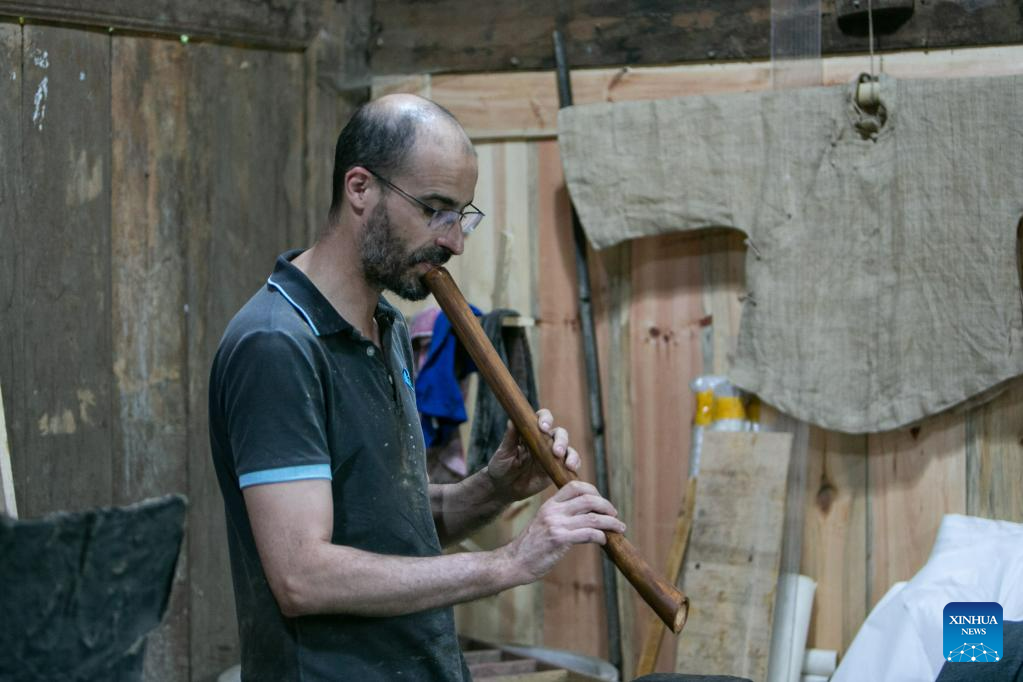 Vincent Cazeneuve plays the shakuhachi flute at his studio in Songbai Village of Beiping Town, Chengkou County, southwest China's Chongqing Municipality, May 29, 2023. (Xinhua/Chu Jiayin)