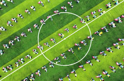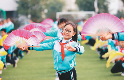 Soon after, accompanied by lively music, more than 1,300 students held flower fans and performed Caidiao opera, synchronizing their movements with the rhythmic beat of the drums.