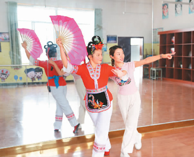 Lai Lisha, a dance teacher, helps Huang Jiashan (left) rehearse at the headquarters of the Liucheng Experimental Primary School in Liucheng county, Liuzhou city, south China's Guangxi Zhuang Autonomous Region. (People's Daily Overseas Edition/Shi Chang)